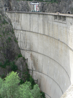 This was the 3rd attempt to get photos of the curves, and we only managed this with a lot of patience, on this side of the mountain it seems they get a lot of cloud and on many days you wont get this view. How on earth did Clarkson & Co manage to get such a fantastic day to drive the road. This was July and you can still see small patches of snow at the side of the road. When you reach the summit of the road, you go through an 800m long and dark tunnel to emerge into bright sunlight, a nice road with less severe corners and a restaurant/ski hotel where we stopped for a late lunch, before letting the coin decide do we go on to the Vidraru Dam or not. The coin said we go on. The road along the side of the Dam is rutted in the extreme, potholes covering almost the entire width of the road. Patched tar, and holes filled in with loose stones. If you want to practice for off roading this is the place to visit.